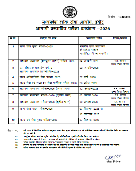 MPPSC द्वारा जारी इस कैलेंडर में असिस्टेंट प्रोफेसर, असिस्टेंट डायरेक्टर, डिप्टी डायरेक्टर, प्रिंसिपल (क्लास-II), डेंटल सर्जन, माइनिंग ऑफिसर और स्टेट इंजीनियरिंग सर्विस जैसे पदों की परीक्षाएं शामिल हैं.