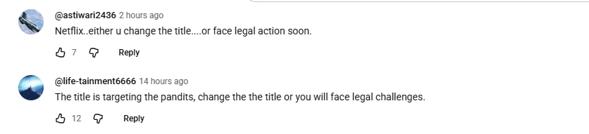 लोगों का रिएक्शन काफी गुस्से में दिख रहा है ट्रेलर लॉन्च के बाद से ही. कुछ लोग लिख रहे हैं 'नेटफ्लिक्स के मुताबिक आतंकवाद का कोई धर्म नहीं होता, लेकिन भ्रष्टाचार की एक बिरादरी होती है'. वहीं दूसरे यूजर ने लिखा 'फिल्म का टाइटल बदलो वरना इसको बॉयकॉट किया जाएगा.' इन कमेंट्स से ये तो साफ है कि लोग फिल्म के टाइटल को लेकर गुस्से में हैं. फिल्म के रिलीज में ये मुद्दा अर्चन डाल सकता है.