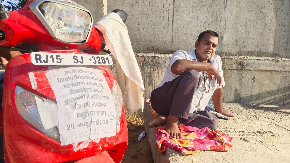 अनु रंगा राजस्थान के जैसलमेर के रहने वाले हैं. वह दिव्यांग हैं और अपनी पत्नी के ट्रांस्फर के लिए लड़ाई लड़ रहे हैं. वो 24 अक्टूबर को अपनी चार-पहियों वाली स्कूटी पर बैठकर 650 किलोमीटर का लंबा सफर तय करते हुए जयपुर आ पहुंचे. पत्नी की पीड़ा और उनका संघर्ष अब दूरी से नहीं झेला जा रहा था. अनु की पत्नी बीना रंगा, जो खुद भी दिव्यांग हैं, 2019 से बांसवाड़ा के सेमलिया स्थित उच्च प्राथमिक विद्यालय में तृतीय श्रेणी शिक्षक के रूप में कार्यरत हैं. जैसलमेर और बांसवाड़ा दोनों के बीच की दूरी करीब 735 किलोमीटर. ऐसे में इतनी बड़ी दूरी और सिर्फ 13 महीने की दुधमुंही बच्ची ध्रुविका की ज़िम्मेदारी नौकरी पर बन आई है.