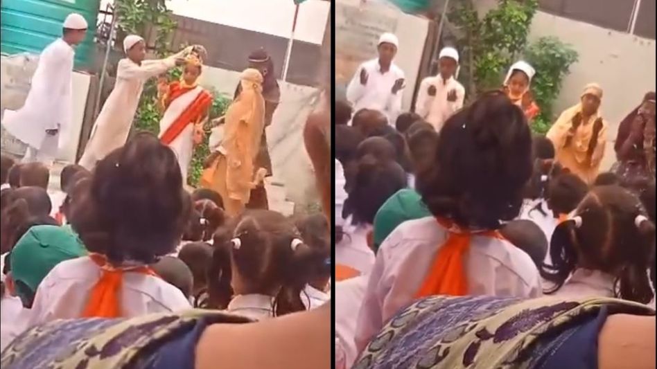इन सबके बीच सोशल मीडिया पर दिल्ली के किसी सरकारी स्कूल का बताकर एक वीडियो शेयर किया जा रहा है. वीडियो किसी कार्यक्रम का है, जिसमें भारत माता की पोशाक पहनी हुई एक बच्ची के सिर पर से कुछ बच्चे मुकुट उतारकर उस पर सफेद कपड़ा बांधते हुआ नज़र आ रहे हैं. इसके बाद मंच पर खड़े बच्चे नमाज पढ़ना शुरू कर देते हैं.