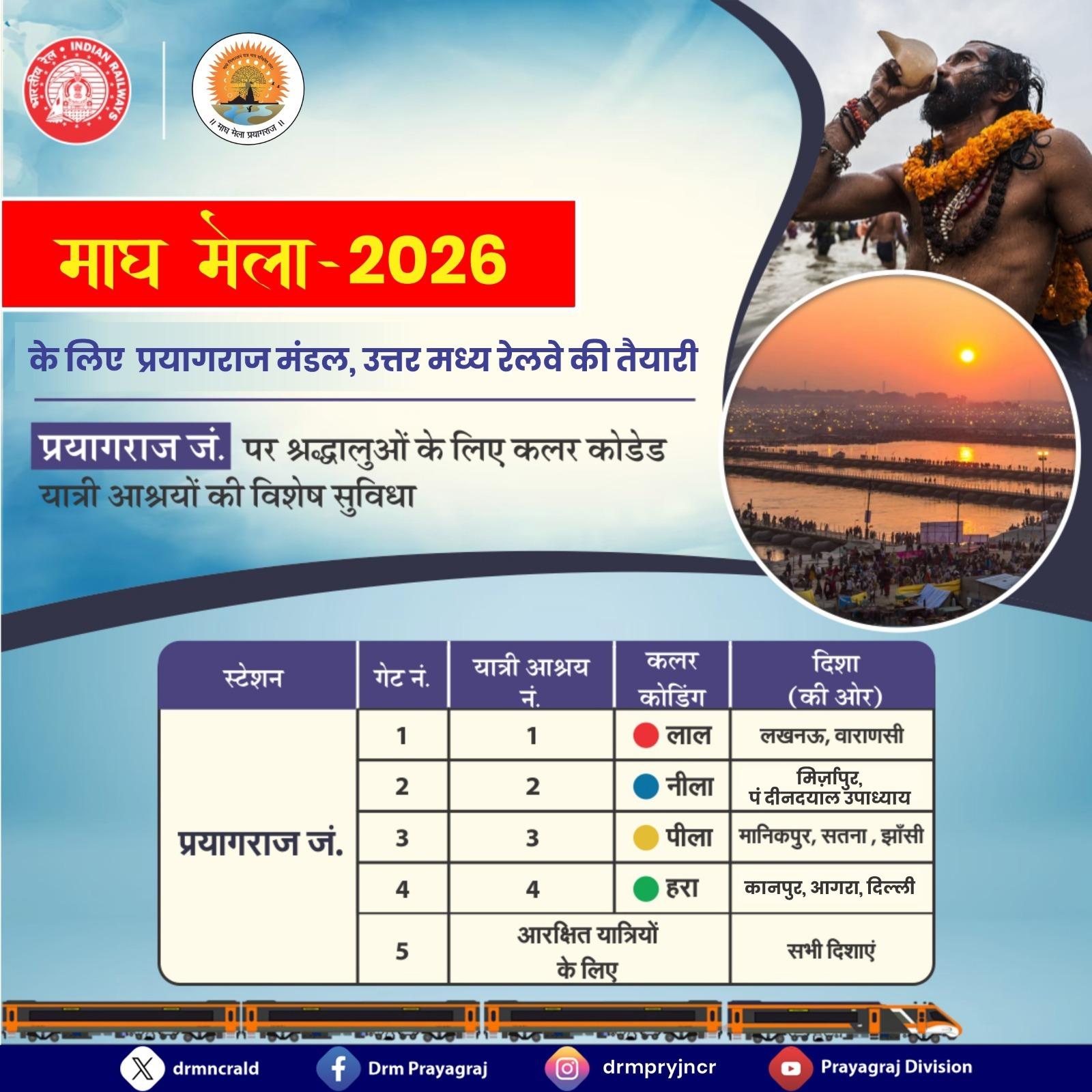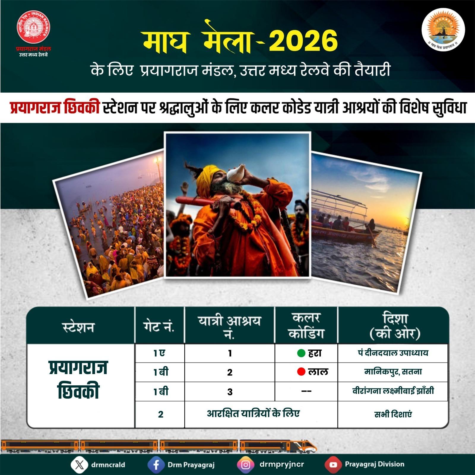 प्रयागराज, माघ मेला-2026 के दौरान प्रयागराज मंडल ने प्रमुख स्टेशनों पर दिशावार कलर कोडिंग प्रणाली शुरू की है. इसका उद्देश्य करोड़ों श्रद्धालुओं को सहज, सुरक्षित और भ्रमरहित आवाजाही प्रदान करना है. डीआरएम श्री रजनीश अग्रवाल के आदेश पर सीनियर डसीएम श्री हरिमोहन की अगुवाई में प्रयागराज जंक्शन, छिवकी, नैनी व सूबेदारगंज पर ये व्यवस्था लागू हो रही है.