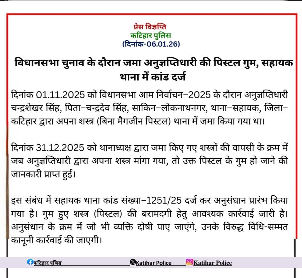दरअसल, किसी भी चुनाव होने के पूर्व आमजन जो हथियार के अनुज्ञप्तिधारी यानी लाइसेंसी हैं. जिन्होंने लाइसेंस लेकर हथियार रखा है. उन सभी का हथियार संबंधित थाने में जमा ले लिया जाता है और फिर चुनाव खत्म होने के बाद उन्हें उनका हथियार वापस दे दिया जाता है, इसी क्रम में 2025 में होने वाले विधानसभा चुनाव पूर्व 01 नवंबर 2025 को किशनगंज में पदस्थापित किसी सरकारी अधिकारी हैं. जो कटिहार में सहायक थाना क्षेत्र के लोकनाथ नगर के स्थाई निवासी हैं, इनका लाइसेंसी पिस्टल को सहायक थाना में जमा लिया गया था.