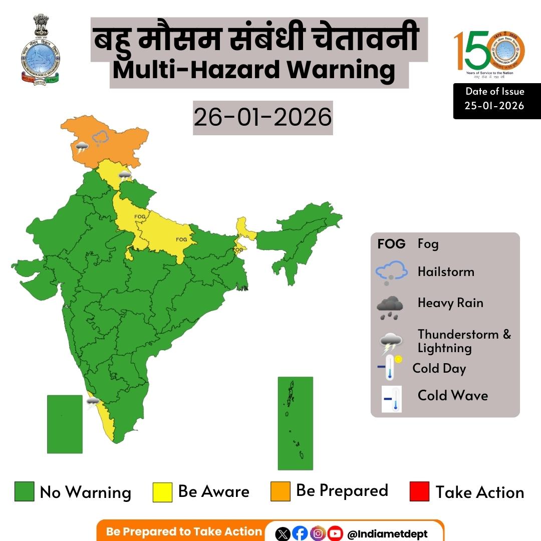 मौसम विभाग ने बताया कि पश्चिमी विक्षोभ के प्रभाव से 26 से 28 जनवरी के दौरान पश्चिमी हिमालयी क्षेत्र जम्मू-कश्मीर, हिमाचल प्रदेश और उत्तराखंड में कई जगह हल्की से मध्यम बारिश और बर्फबारी हो सकती है. खासतौर पर 27 जनवरी को कुछ स्थानों पर भारी बारिश और भारी बर्फबारी की चेतावनी जारी की गई है. इसके अलावा, पहाड़ी क्षेत्रों में ओलावृष्टि की प्रबल संभावना भी जताई गई है, जिससे जनजीवन प्रभावित हो सकता है.