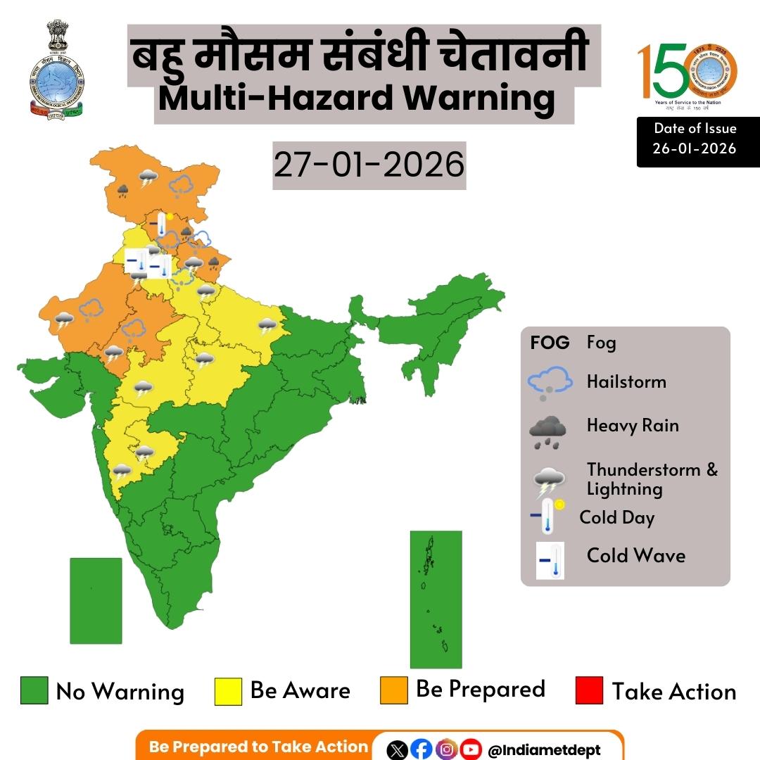 जनवरी का महीना लगभग पूरा होने जा रहा है, लेकिन ठंड अभी भी लोगों को कंपकंपाने पर मजबूर कर रही है. इसी बीच मौसम विभाग ने एक नया अलर्ट जारी करते हुए कई राज्यों में मौसम बिगड़ने की चेतावनी दी है. 27 जनवरी को दिल्ली, उत्तर प्रदेश, तमिलनाडु, राजस्थान और जम्मू-कश्मीर समेत देश के कई हिस्सों में बारिश और तेज हवाओं की संभावना जताई गई है.