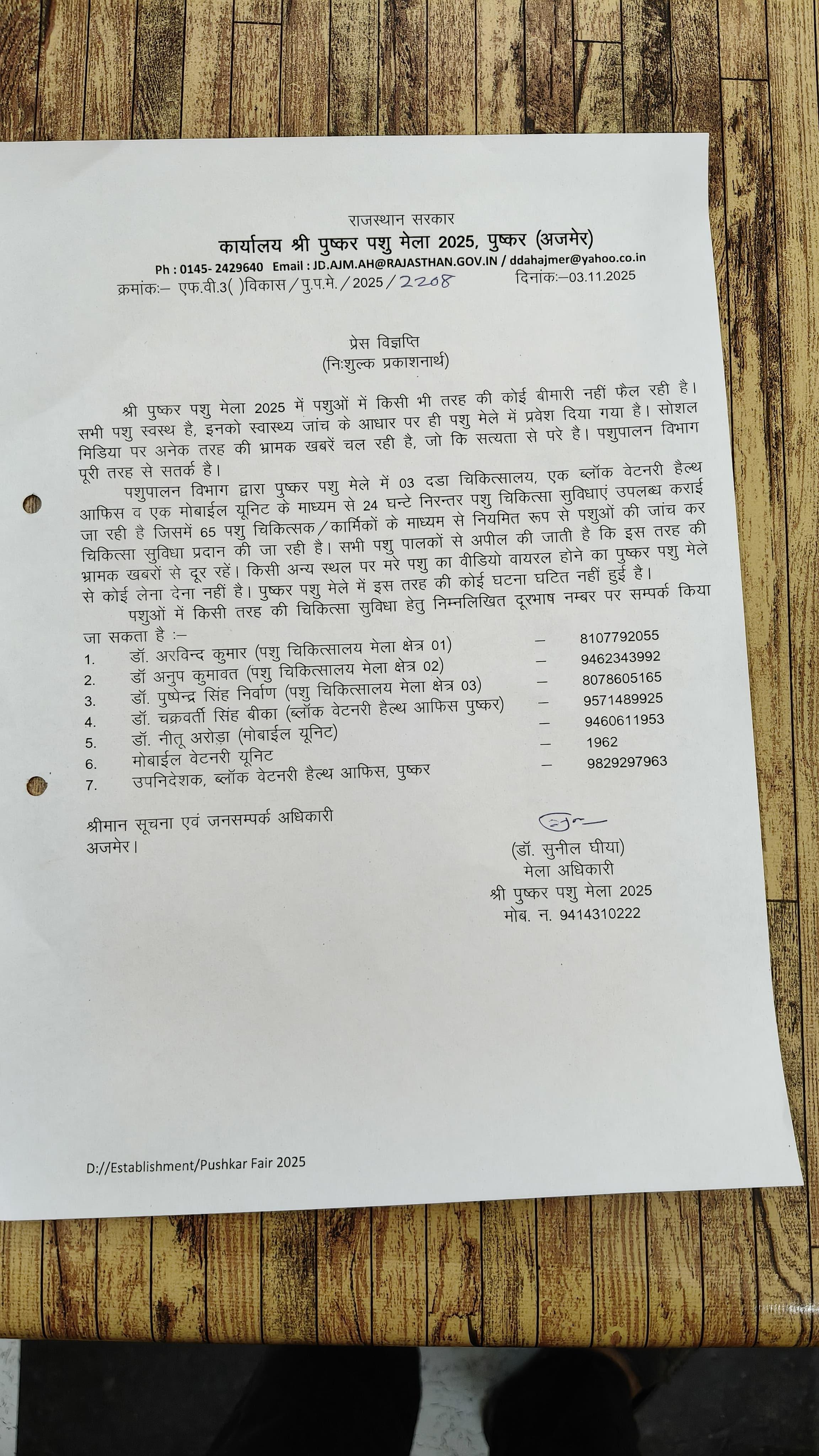पुष्कर के मेला अधिकारी एवं पशुपालन विभाग के संयुक्त निदेशक सुनील घीया ने बताया कि अनमोल नाम का भैंसा मेले में आया ही नहीं है और यहां जो भैंसे आए हैं, उनकी कई बार स्वास्थ्य जांच कर ली गई है. मरने की बात तो दूर, कोई भैंसा बीमार भी नहीं हुआ है. पशुपालन विभाग यहां आने वाले हर जानवर की जानकारी रखता है. उसके आने की और जाने की जानकारी भी पशुपालन विभाग रोजाना मीडिया को देता है.