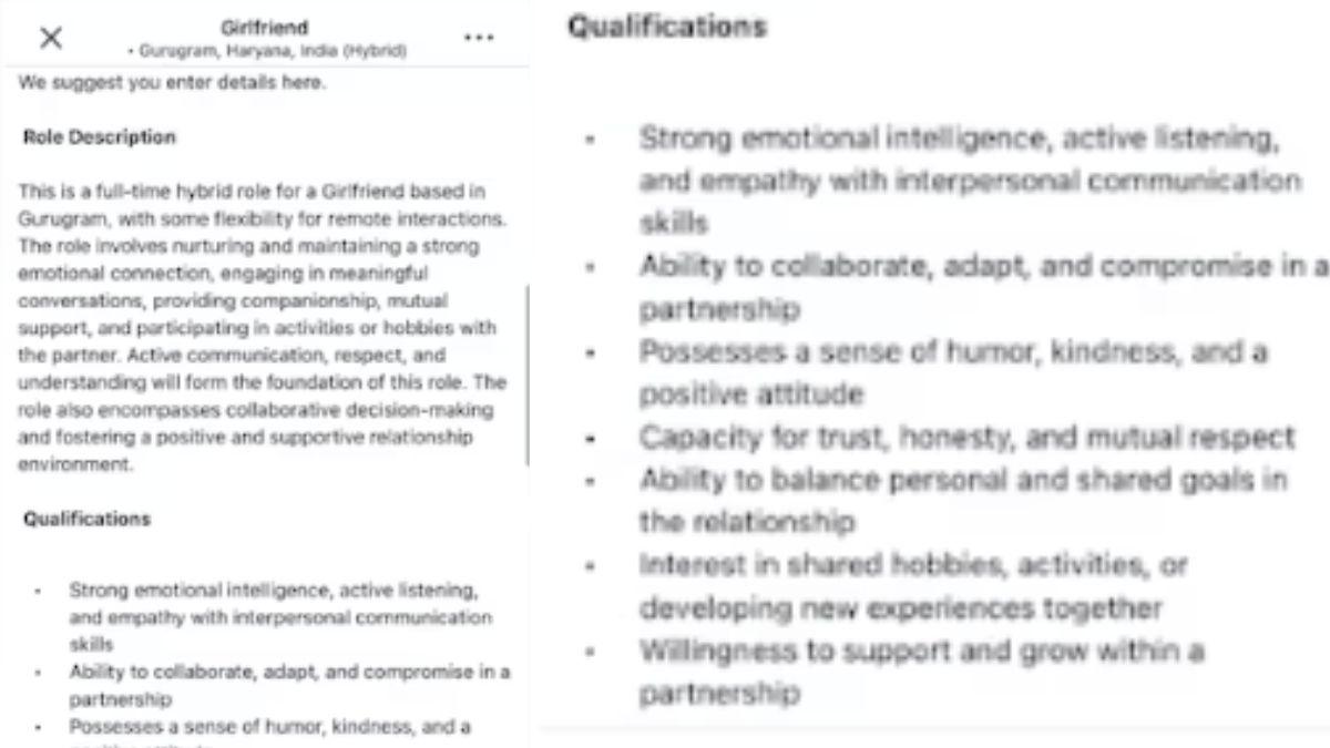 यूजर ने गर्लफ्रेंड की खूबियों की एक लंबी लिस्ट दी है. जिसके आधार पर वो इस जॉब के लिए सही उम्मीदवार का चयन करेगा. विज्ञापन के मुताबिक गर्लफ्रेंड में एक मजबूत भावनात्मक संबंध, सार्थक बातचीत, हमेशा सहयोग करना और सभी गतिविधियों में पार्टनर का साथ देने जैसे गुण होने चाहिए.
