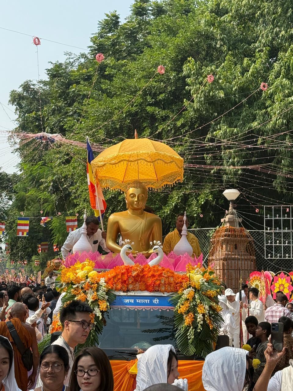 कार्तिक पूर्णिमा पर सारनाथ में आस्था, भक्ति और संस्कृति की अद्भुत छटा देखने को मिली. 'बुद्धम शरणम गच्छामि' मंत्रोच्चार के बीच भगवान बुद्ध की फूलों से सुसज्जित मूर्ति के साथ भव्य शोभायात्रा निकाली गई. शंख-नाद और वाद्य-ध्वनियों के बीच मूलगंध कुटी विहार से आरंभ यह यात्रा सारनाथ के प्रमुख मार्गों से होकर पुनः विहार में संपन्न हुई. धर्म भाव से ओत-प्रोत श्रद्धालुओं ने पवित्र अवशेषों के दर्शन के बाद अंतिम प्रणाम किया और संकल्प लिया कि वे बुद्ध के उपदेशों को अपने व्यवहार, विचार और जीवन में उतारकर ही सच्ची श्रद्धांजलि दे सकते हैं.