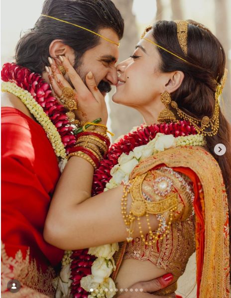 वहीं रश्मिका गोल्डन ज्वेलरी और लाल-गोल्ड साड़ी में दुल्हन के रूप में बेहद खूबसूरत दिखाई दे रही हैं.