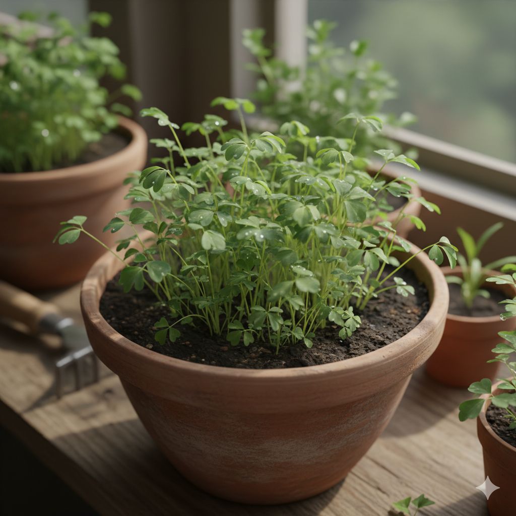 अब मिट्टी में एक मुट्ठी मेथी के दाने छिड़कें और हल्की मिट्टी से ढक दें.